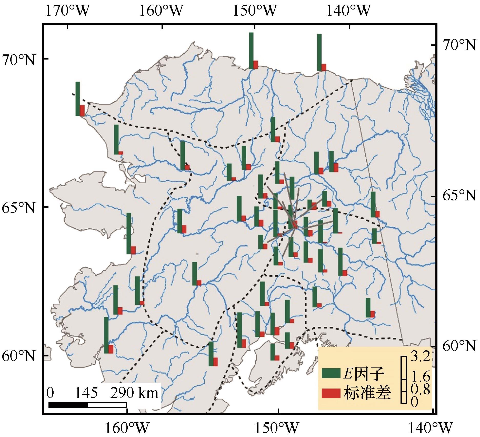 图6. 利用年冻结指数(基于CMIP6历史实验的近地表日气温数据)与对应的实测最大河冰厚度计算各河冰观测站点的E因子及其标准差 |