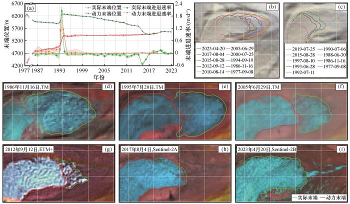 ... 维格勒当雄冰川动力末端与实际末端间的非活动冰体在2018年9月时已基本消融殆尽,并且由于动力末端的推进,两类末端的界限已大致重合.同时,图3(a)显示维格勒当雄冰川末端2017年8月开始前进,至2021年9月总计前进(99±7) m,表明维格勒当雄冰川于2017年之前再次发生跃动.Pan等[20]通过冰川表面运动速度的变化,揭示出维格勒当雄冰川冰舌区上段的加速运动最早出现于2015年,表明维格勒当雄冰川的本轮跃动大致发起于2015年.Pan等[20]的研究结果同时认为,维格勒当雄冰川的本轮跃动在2021年之后仍处于活动状态.但图3(a)显示维格勒当雄冰川末端在2021年9月之后再次出现退缩,至2023年4月累计退缩约(10±7) m,说明维格勒当雄冰川的本次跃动在2021年9月之后已基本结束. ...