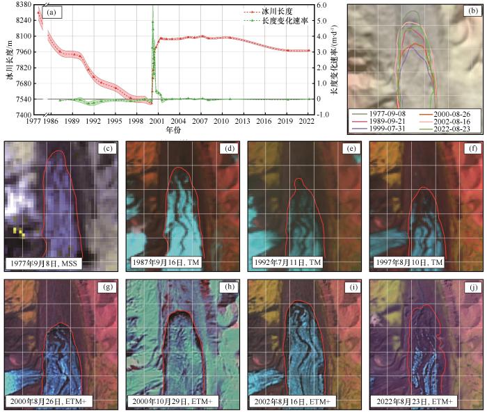 ... 维格勒当雄冰川[全览见图1(c)]位于阿尼玛卿山东北坡,2022年冰川末端与G0615高速公路隧道出口直线距离约为1.5 km[见图1(a)],也是玛卿岗日冰帽的外溢冰川之一.Pan等[20]利用Landsat、Sentinel-2卫星影像、1985年航摄地形图以及2000年SRTM,研究了维格勒当雄冰川1992—2021年期间的跃动行为,发现维格勒当雄冰川分别于1992—1994年和2015年以来分别发生两次跃动.本文也基于Landsat和Sentinel-2卫星影像,利用维格勒当雄冰川的长度变化对其1977年以来的跃动过程进行了恢复[图(3)]. ...