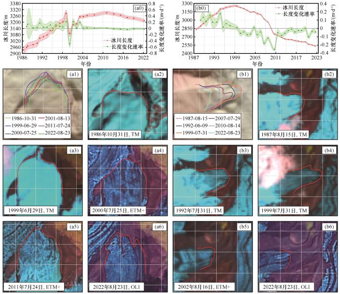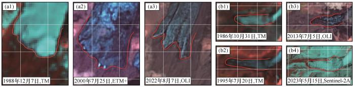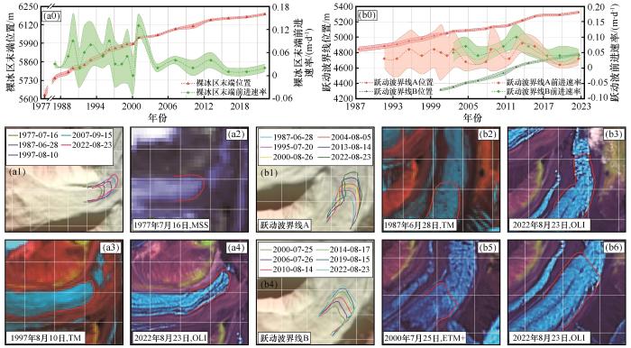... 图6(b)系列子图为哈龙南支表面典型地物的变化过程.其中,图6(b2)和图1(e)均显示出哈龙南支冰川的裸冰区有非常明显的串珠状形态特征.这一现象说明哈龙南支冰川上部存在周期性冰川物质下泄,产生类似跃动波[33]的特殊运动过程,并向下游不断运动.为更好地揭示这些跃动波的传递过程,本文对冰川表面先后形成的两条明显跃动波前端界线(跃动波界线A和B)进行追踪.图6(b0)显示,哈龙南支冰川表面跃动波界线A在1987—2022年间累计前进了(481±34) m[见图6(b2)和图6(b3)],平均运动速度(3.7±0.3) cm·d-1[(13.7±0.9) m·a-1].其上部的跃动波界线B在2000—2022年间也累计前进(465±21) m[见图6(b5)和图6(b6)],平均运动速度(5.8±0.3) cm·d-1[(21.0±1.0) m·a-1]. ...