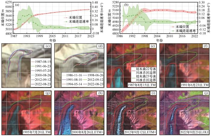 ... ])和2022年7月29日Sentinel-2A影像,定位精度采用10 m.分边界类型的面积误差计算方法详见文献[25]中公式(1)及其说明,冰川长度(晓玛沟和维格勒当雄冰川为末端位置)和冰川表面地物界线位置及其运动速度的误差计算参见文献[12]中公式(5)~(7).由于文中所有末端位置和地物界线的提取均采用公认最为精确的人工目视解译方法[30]实现,因此运动速度误差的计算未考虑特征匹配方法的不确定性. ...
