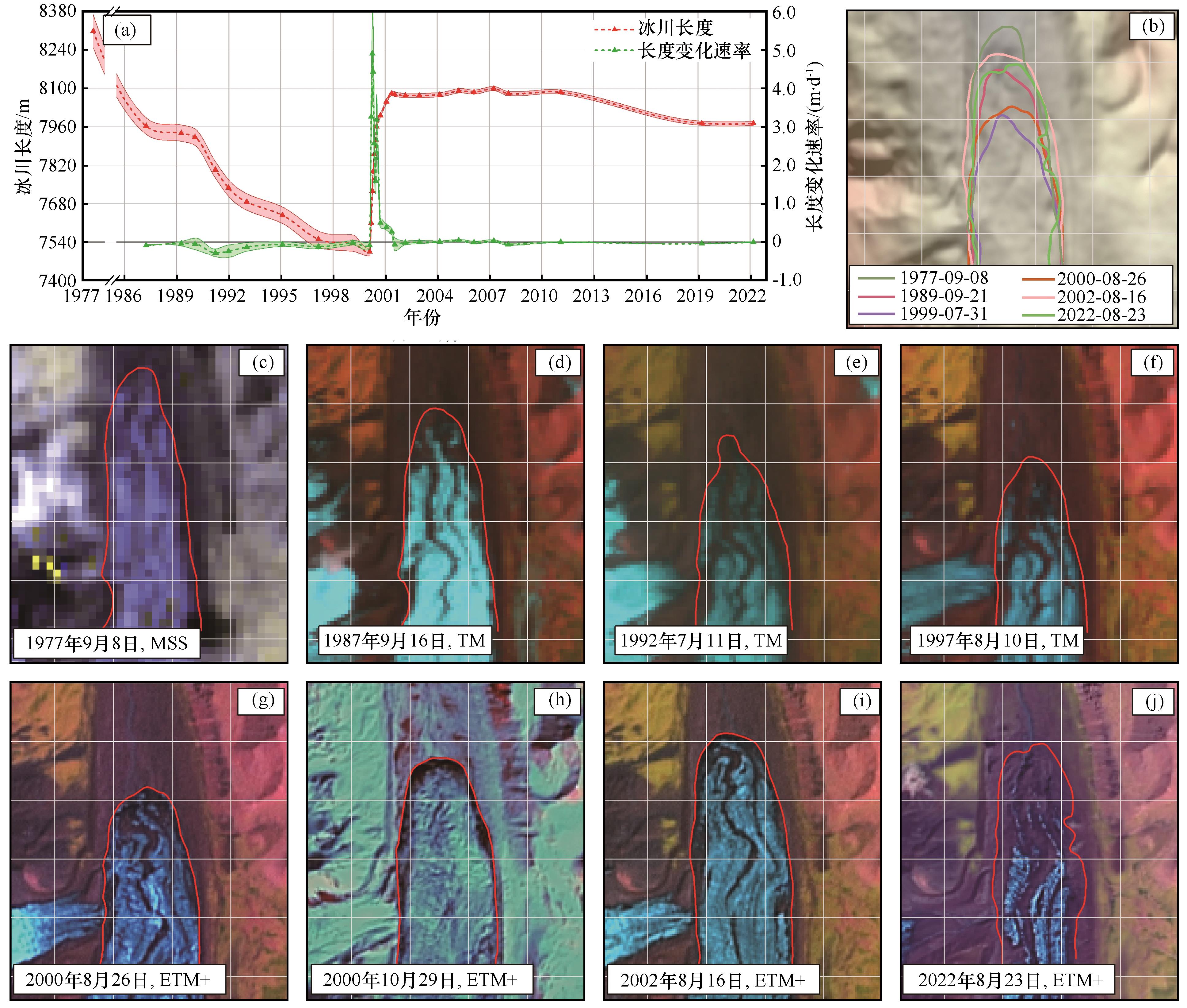 图4. 耶合龙冰川1977年以来的末端位置变化(a)、(b)和末端以上冰舌区遥感影像(c)~(j) |