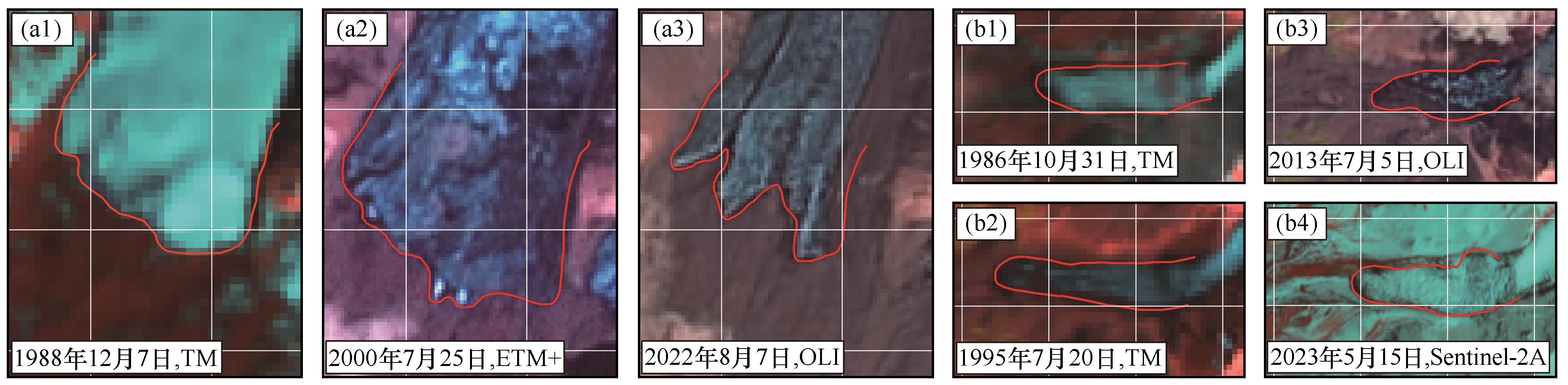 图8. 切木曲1号(a)和曲什安22号(b)冰川末端以上冰舌区遥感影像(不同下标对应不同日期) |