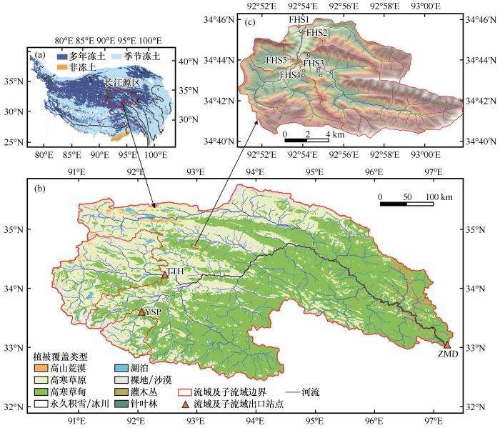 图1 长江源区研究流域站点分布图: 青藏高原冻土分布[4 ] 及长江源区位置(a);长江源区植被类型和流域站点分布(b);风火山流域及其子流域(c) Maps of the study sites of the Yangtze River source region (YRSR): the distribution of permafrost in the Qinghai-Tibet Plateau[4 ] and the location of the YRSR (a); the vegetation types and the distribution of the study area of the YRSR (b); the FHS watersheds and the sub-watersheds (c) Fig. 1 ![]()