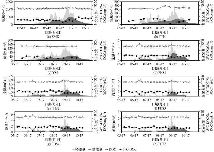 ... 稳定同位素13 C是研究河流DOC来源的有力工具,不同来源的碳具有不同的同位素特征[24 ] .河流DOC的主要来源是陆地生态系统中的土壤、植被以及河流内源生成的碳等,可利用稳定碳同位素示踪法分析河流DOC来源.C3植物的δ 13 C值约为 -27‰,而C4植物的δ 13 C值约为-11‰[25 -26 ] ,河流中浮游植物的δ 13 C值为-44‰~-32‰,细菌物质的δ 13 C值为-25‰~-16.4‰,河流内源生产的δ 13 C-DOC值可达-47‰~-8‰[27 ] .不同来源和迁移转化混合过程会使河流DOC显示出不同的δ 13 C-DOC同位素值,根据同位素混合模型Miller-Tans plot可以计算得知DOC的来源特征[28 -29 ] . ...