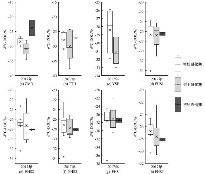... 时间尺度上8个研究流域δ 13 C-DOC同位素值的季节变化不明显,完全融化期8—9月δ 13 C-DOC值较低,除少数变化异常的点,季节变化幅度均较小(图2 ),并且8个研究流域δ 13 C-DOC同位素具有类似的季节特征(图6 ).空间尺度上各流域δ 13 C-DOC同位素值差异不明显,变化范围在-37.57‰~ -21.06‰之间,各流域的年内平均值变化范围在 -30.00‰~-26.79‰之间,雁石坪水文站平均δ 13 C-DOC值最小(-30.00‰),FHS1号流域最大 (-26.79‰),8个研究流域的总体平均值为 -27.71‰(表5 ),处于全球大多数河流δ 13 C-DOC值变化范围之内[13 ] . ...