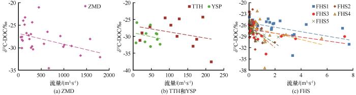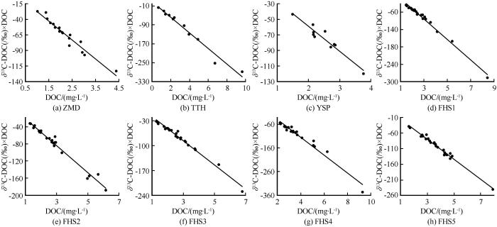 ... 利用Miller-Tans plot图解法来分析DOC来源碳同位素特征,Miller-Tans plot图解法可以仅基于一种样品的稳定同位素值和浓度特征求得DOC来源碳同位素特征,从而确定其来源范围,该方法基于以下质量平衡混合方程[28 -29 ,37 ] : ...