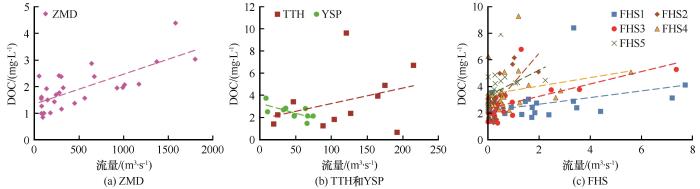 ... 空间尺度上,长江源多年冻土区上游DOC浓度大于下游DOC浓度,原因可能是:(1)下游的高径流虽然带来了更多的有机碳物质,但同时也稀释了DOC的浓度,并且稀释作用大于冲刷作用导致DOC浓度较低;(2)根据河流连续体概念[56 ] ,上游地区单位水域面积接受的陆源有机碳大于下游地区;(3)河流有机碳在河流向下输送的途中还存在着过程性的微生物和光化学降解,导致下游河流DOC浓度较小.在长江源多年冻土区的8个研究流域中,只有雁石坪流域DOC浓度与径流量呈负相关,其余7个流域均呈正相关(图8 ).下游直门达水文站处DOC浓度与径流量相关系数最大,达到0.73,这可能与其流域面积大,径流量大,DOC日通量大相关. ...