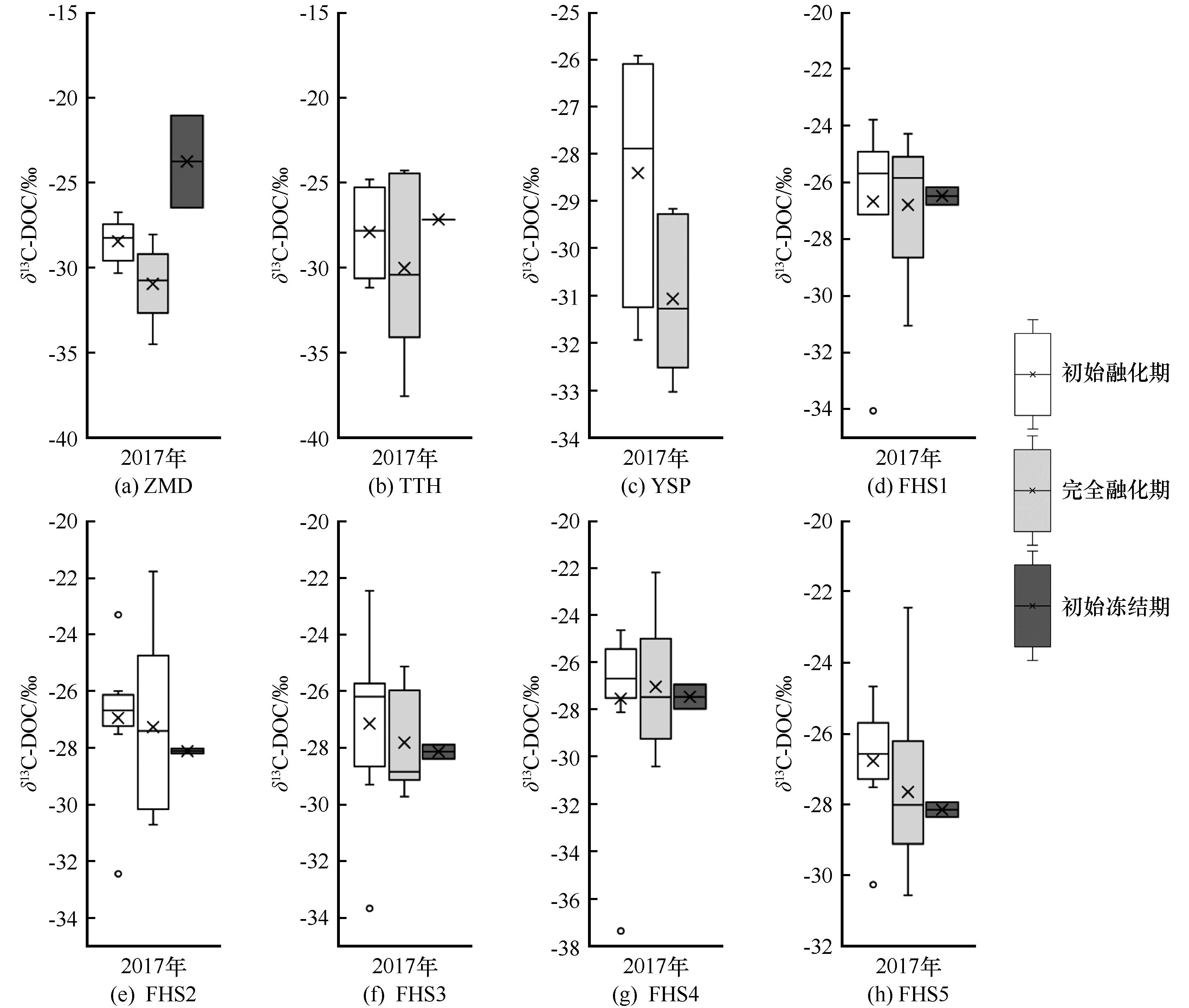 图6. 长江源区研究流域3个不同时期的C-DOC箱线图(×: 平均值;直线: 中位数;T型线: 最大值;⊥型线: 最小值)