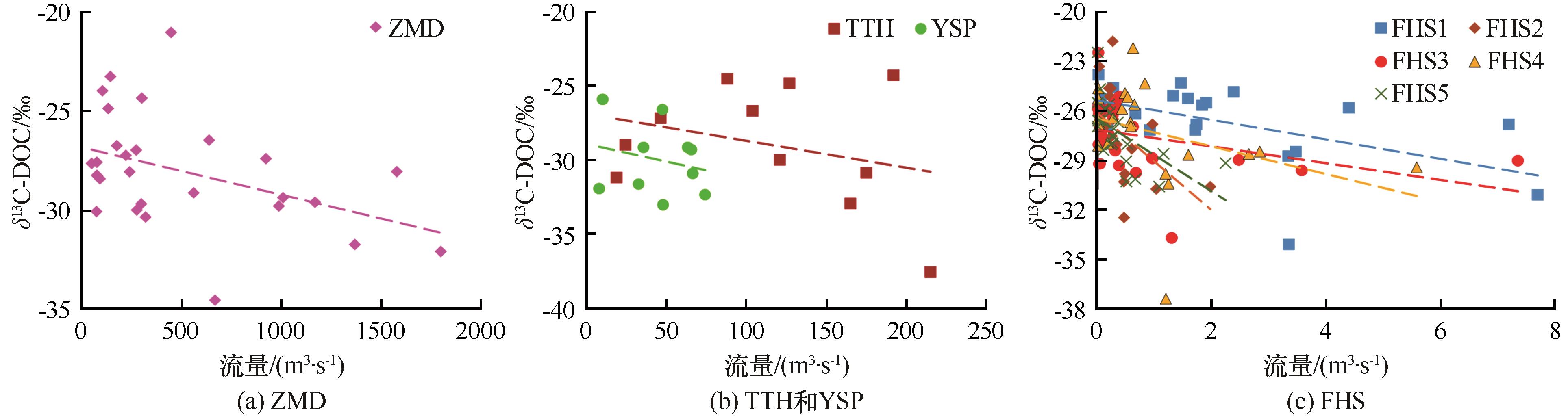 Fig. 9. The response of C-DOC over runoff across our studied sites of the YRSR: variations of δ13C-DOC with runoff across ZMD (a), TTH and YSP (b), and FHS1~5 (c)