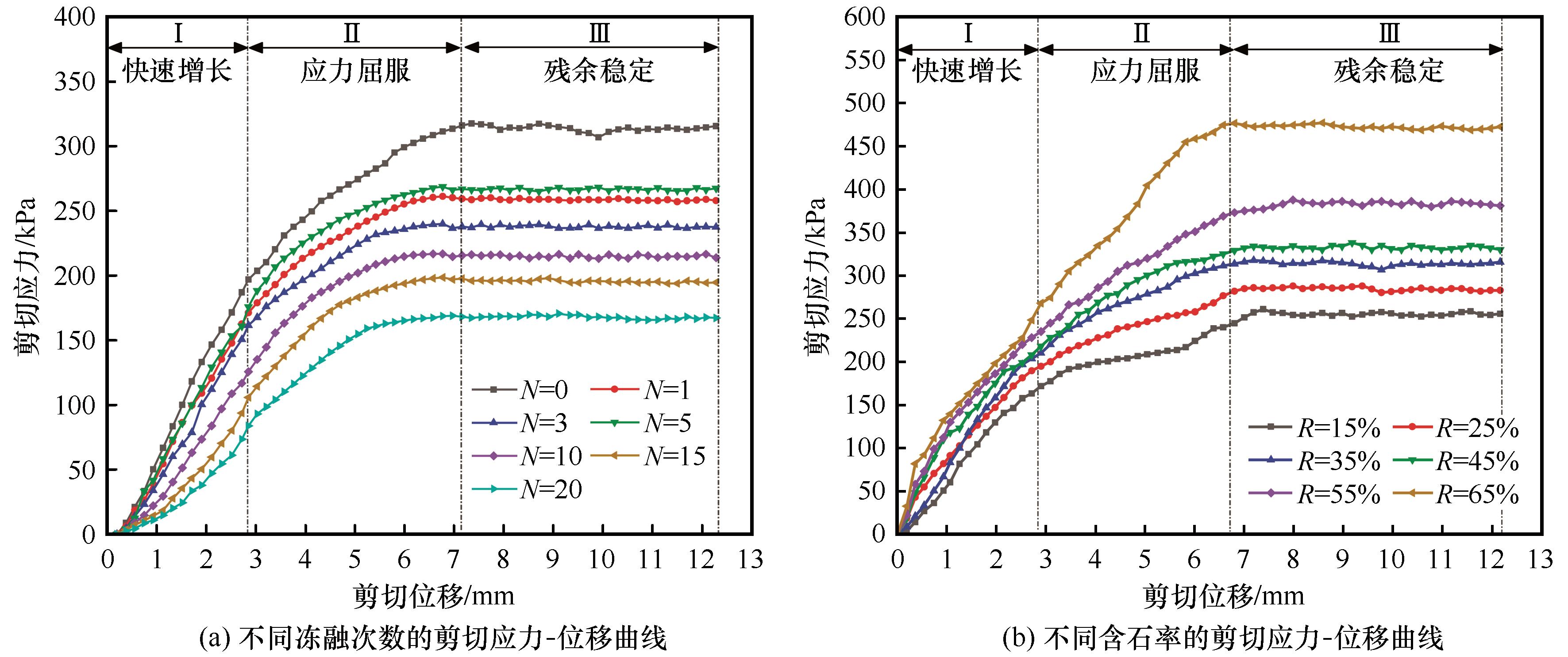 | Fig. 6 Shear stress-displacement curve of soil-rock mixture-concrete interface: with different numbers of freeze-thaw cycles (a) and with different rock contents (b) |