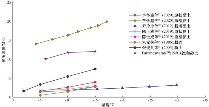 Table 2 温度范围/℃ 试验类型 土质 关系 类型 文献来源 -15~-5 UCS 黏土 指数 李怀鑫等[51 ] (2020) -20~-5 TCS 砂卵石 指数 张晋勋等[52 ] (2018) -30~-10 UCS 粉质黏土 指数 尹珍珍等[13 ] (2012) -15~-5 UCS 黏土 指数 陈士威等[53 ] (2019) -10~-0.5 UCS 粉砂 幂函数 朱元林[45 ] (1986) -15~-2 UCS 粉土 幂函数 张俊兵等[11 ] (2003) -15~-2 UCS 饱和砂土 幂函数 Parameswaran[54 ] (1980)
