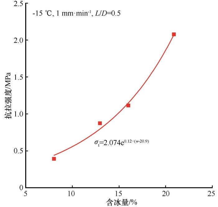 σ t = σ s t e n w ( w - w s ) (8) 式中:σ t 为抗拉强度;σ st 为饱和试样的抗拉强度;w s 为饱和含冰量;w 为含冰量(含水量);n w 为试验参数. ...