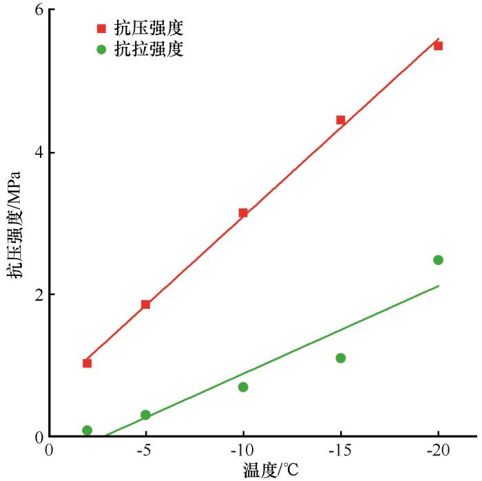 图10 冻结粉土抗压强度、抗拉强度与温度的关系[79 ] Relationships between compressive strength, tensile strength and temperature of frozen silt[79 ] Fig. 10 ![]()