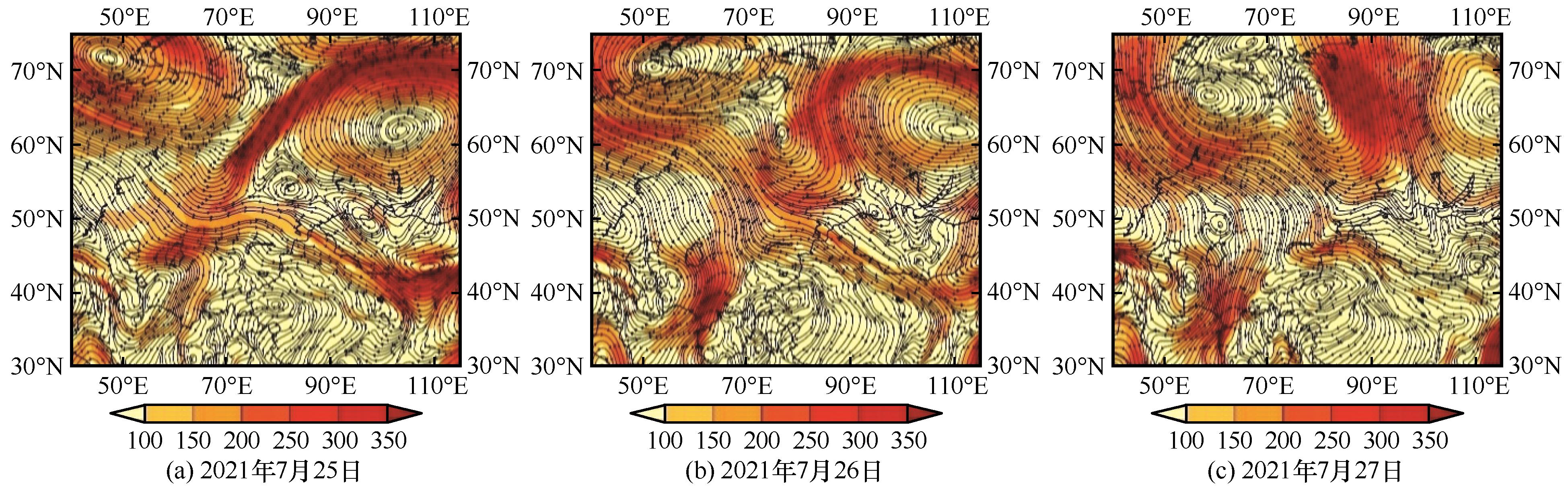 | Fig. 9 The vertically integrated water vapor flux (surface to 500 hPa) [unit: kg?(m?s)-1]: 25th July, 2021 (a); 26th July, 2021 (b); 27th July, 2021 (c) |
