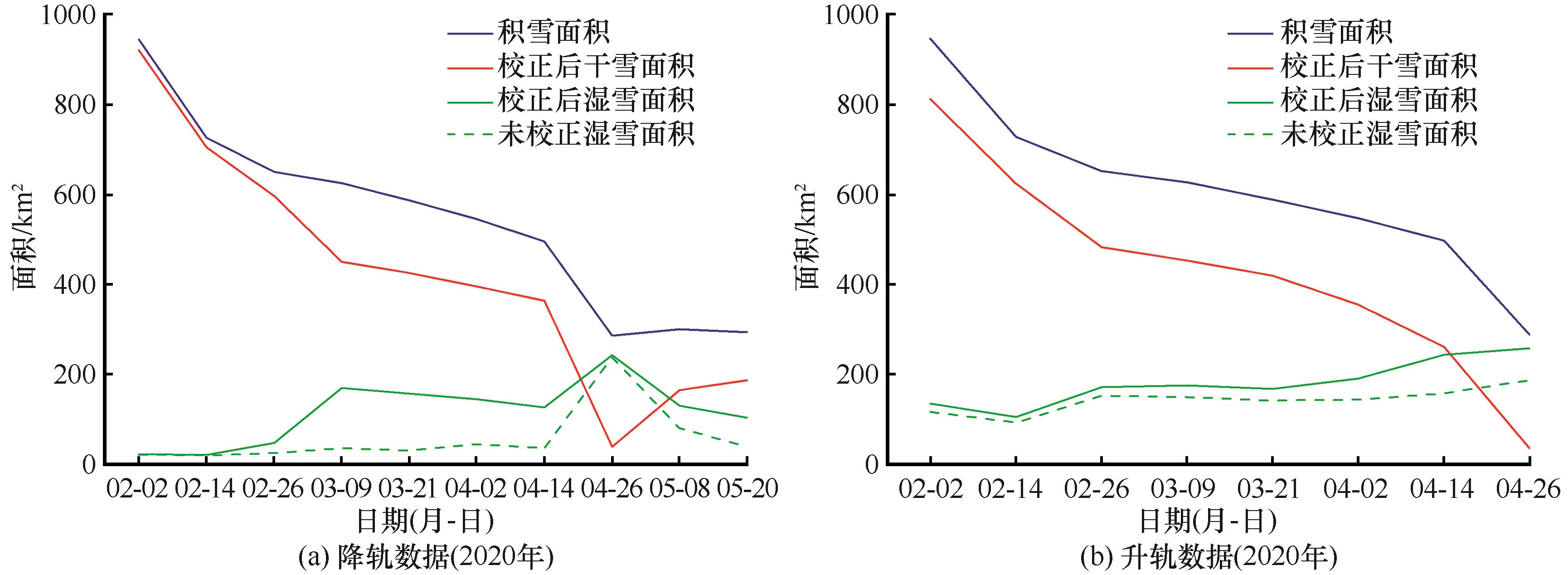 | Fig. 7 Curves of snow cover area and dry and wet snow correction area: descending orbit data (a); ascending orbit data (b) |