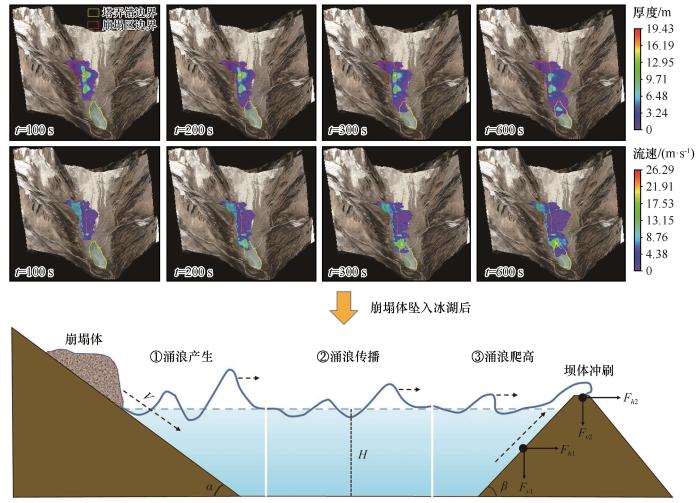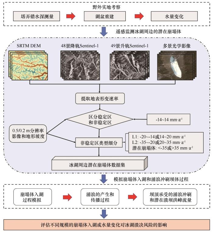 本研究主要基于塔弄错的野外水深测量数据重建了水量,根据地形地貌调查情况和SBAS-InSAR方法提取的流域地表形变速率,识别了冰湖周边的潜在崩塌体等诱灾因素。最后,基于数值模型RAMMS(rapid mass movement simulation)和波浪传播模型,评估了不同情景下崩塌体入湖和水量变化对冰湖溃决风险的影响。塔弄错的潜在溃决风险评估流程如图4所示。