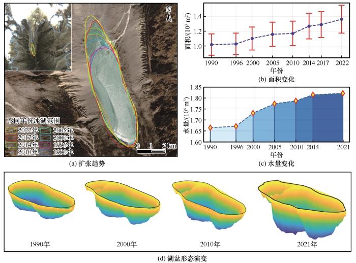 Dynamic evolution process of Tanong Co from 1990 to 2022: lake expansion trend (a), changes in lake area (b), changes in water volume (c) and lake basin morphological changes (d)