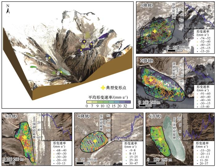 Distribution of the potential collapse areas around Tanong Co (Regions 1, 2, and 4 are the descent data, and regions 3 and 5 are the ascent data) (The base images are from Google Earth imagery)