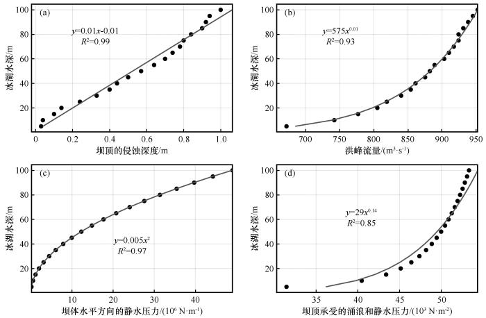 Relationships between different water depth and important parameters of impulse wave propagation and dam erosion: glacial lake depth and erosion depth of the dam crest (a), glacial lake depth and peak discharge (b), glacial lake depth and hydrostatic pressure of the dam crest (c), glacial lake depth and total pressure of the dam crest (d)