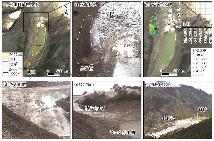 Cause of the Ranzeria Co dam breach and distribution of paraglacial slope failures around the lake: lake change (a), avalanche remains (b), unstable areas (c), glacier tongue disintegration (d), lake surface after GLOF (e) and the GLOF effects (f) (All the photos were taken by Professor Yao Xiaojun in 2017, and the base images are from Google Earth imagery)