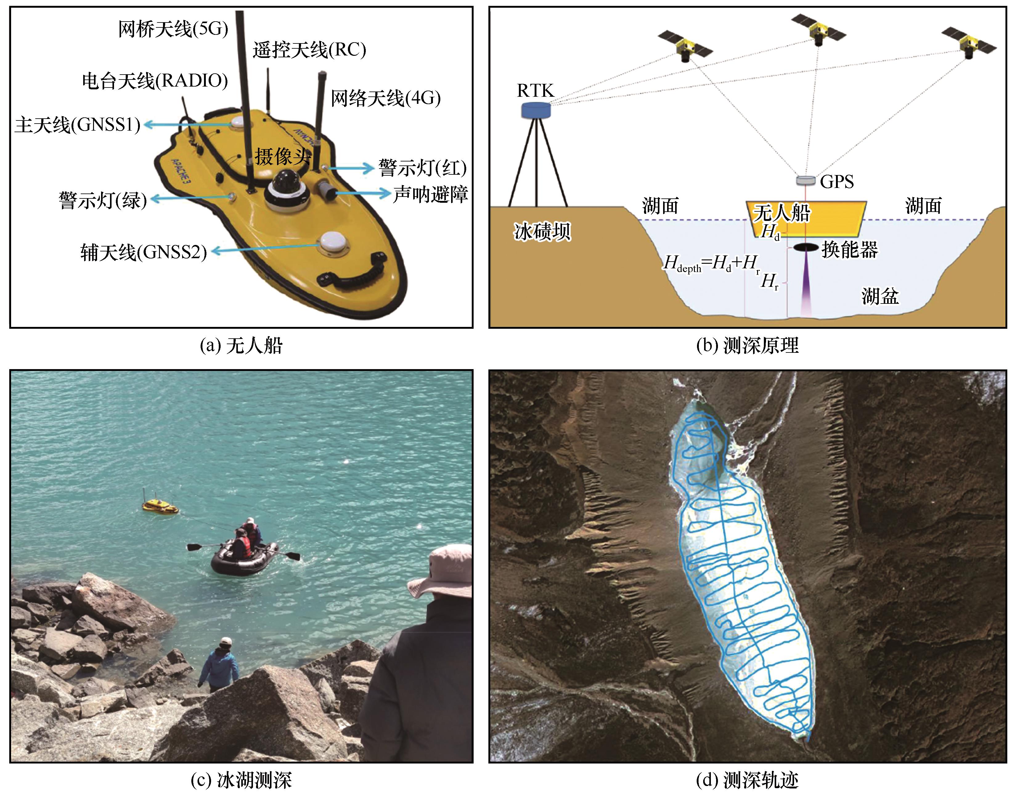 | Fig. 3 Principles of glacial lake sounding and field water depth measurement: unmanned ship (a), principles of sounding (b), glacial lake sounding (c) and sounding track (d) |