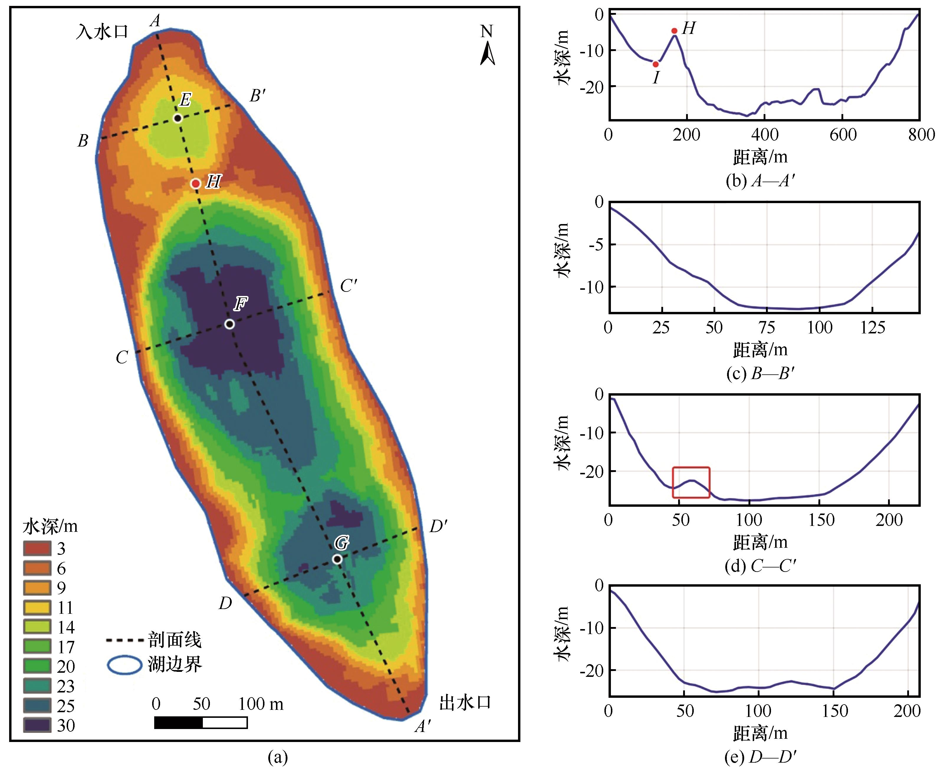 | 图5 塔弄错测深结果(a)及水深剖面线图[(b)~(e)] |