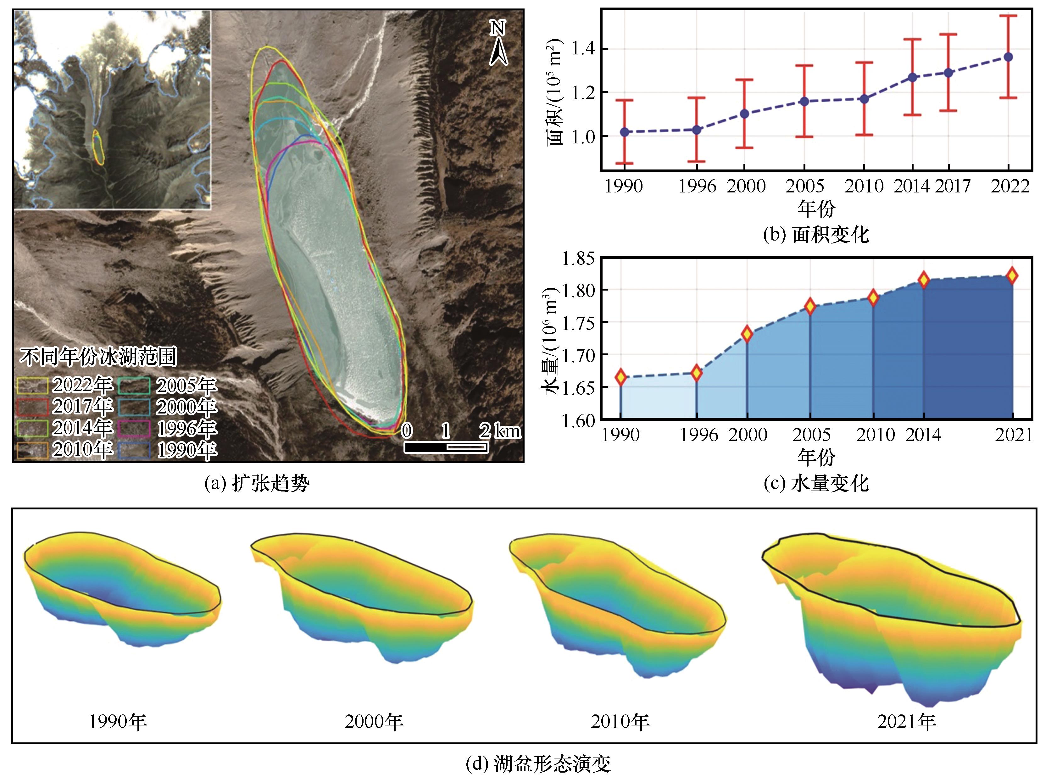 | Fig. 6 Dynamic evolution process of Tanong Co from 1990 to 2022: lake expansion trend (a), changes in lake area (b), changes in water volume (c) and lake basin morphological changes (d) |