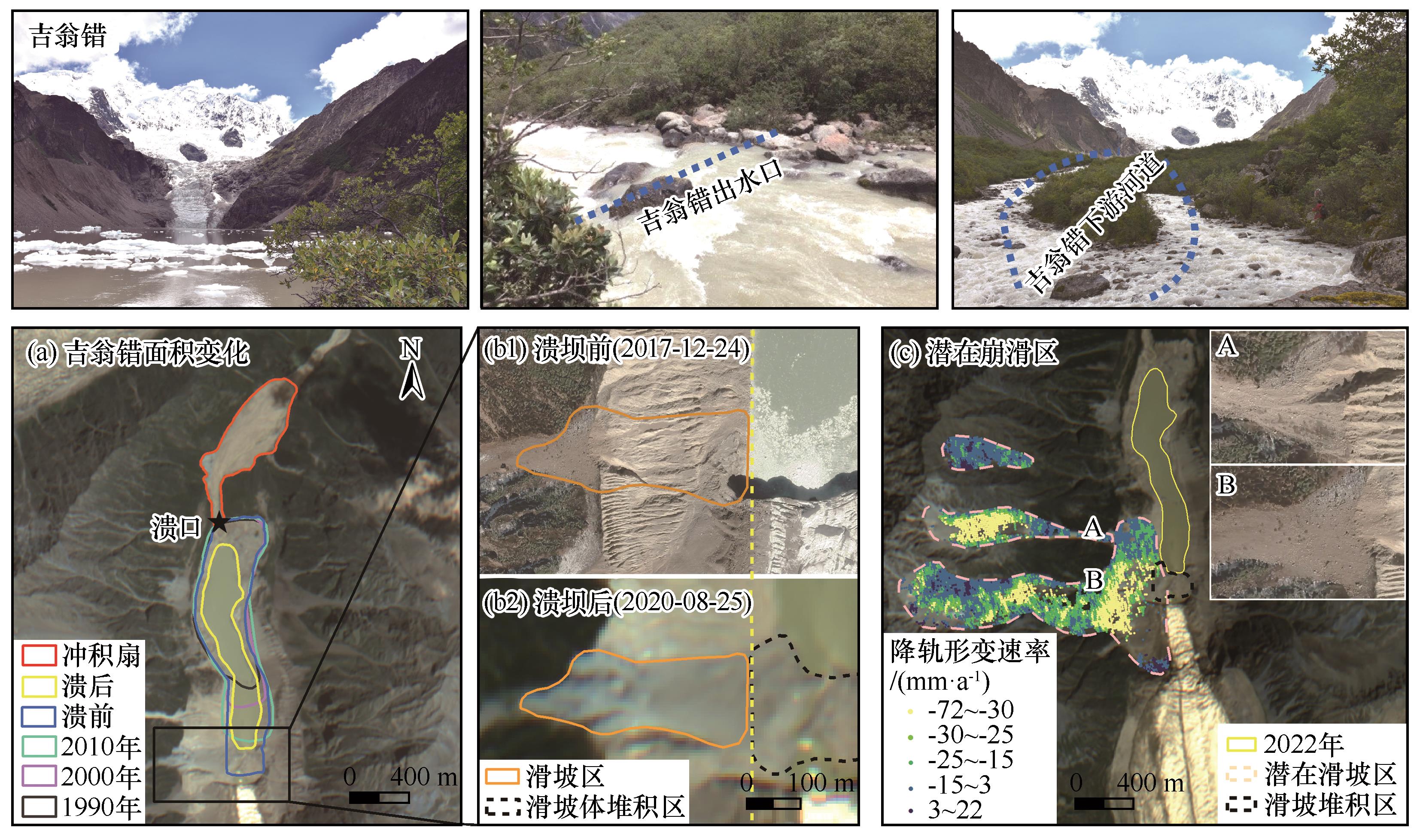 | 图12 吉翁错溃坝诱因和周边不稳定斜坡分布(图中照片均由姚晓军教授在2017年拍摄,底图为Google Earth和资源3号影像) |