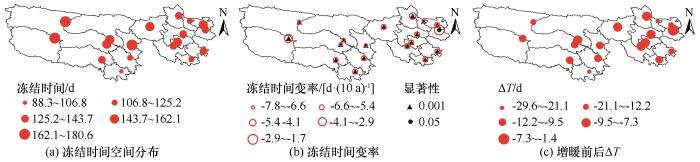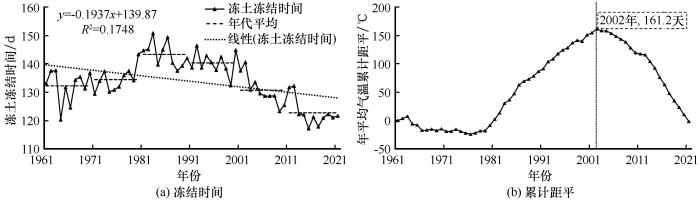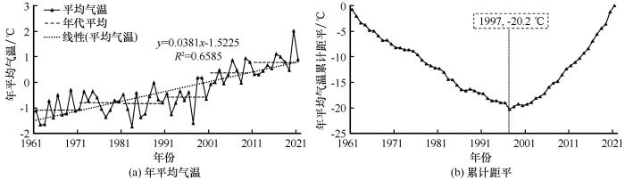... 1961—2021年,三江源区年平均气温为-0.34 ℃,总体表现为显著的升高趋势,升温速率为0.38 ℃·(10a)-1[图2(a)].气温的变化过程并不是持续、均匀的单调增暖,而是呈现出冷暖相间、波动上升的特点.20世纪70年代至90年代后期平均气温相对较低,且变化较为平稳,在1983年出现最低值(-1.7 ℃),进入21世纪后气温开始呈现显著增温趋势,并在2020年达到最高值(2.0 ℃).从三江源区年平均气温累积距平变化曲线来看,年平均气温累积距平呈明显的“单谷型”分布,在1997年出现转折点,1997年之前呈显著的下降趋势,并在1997年达到“谷底”后开始回升[图2(b)],计算其S/N值为1.2,大于1.0,说明1997年为三江源区平均气温的突变年份,这与整个青藏高原年平均气温突变年份一致[40-41].所以,在研究三江源区变暖前后冻土变化特征时,以1997年为时间节点,1997年以前为变暖前期,之后为变暖后期. ...