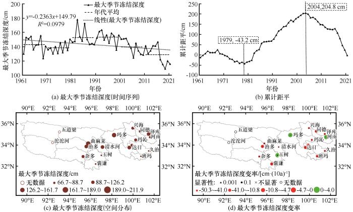 ... 从年最大季节冻结深度累积距平值来看,三江源区年最大季节冻结深度有两个转折点,1979年之前季节冻结深度变化相对平稳,之后呈显著增加趋势,在2004年达到峰值后开始呈减小趋势[图4(b)].计算两个转折点S/N值,其中1979年的S/N值为0.6,小于1.0,2004年的S/N值为1.1,大于1.0,说明年最大季节冻结深度在2004年发生突变,突变后年最大季节冻结深度较之前减小了16.1 cm.年最大季节冻结深度虽然受气温变化影响,但其突变年份与气温突变年份相比有一定推后,说明季节冻结深度由于受其他因素影响,对气温变化有一定的滞后性,这与李林等[32]研究结论较为一致. ...
