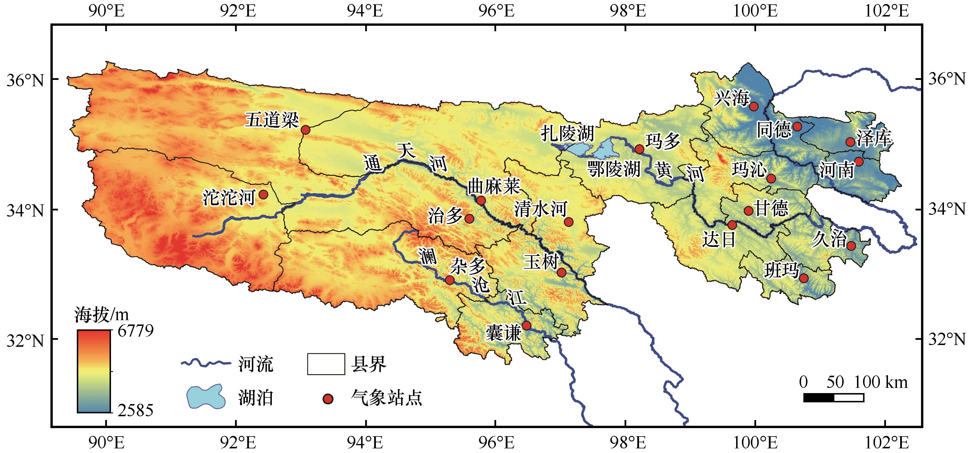 | 图1 三江源区地形及气象站点分布图 |
