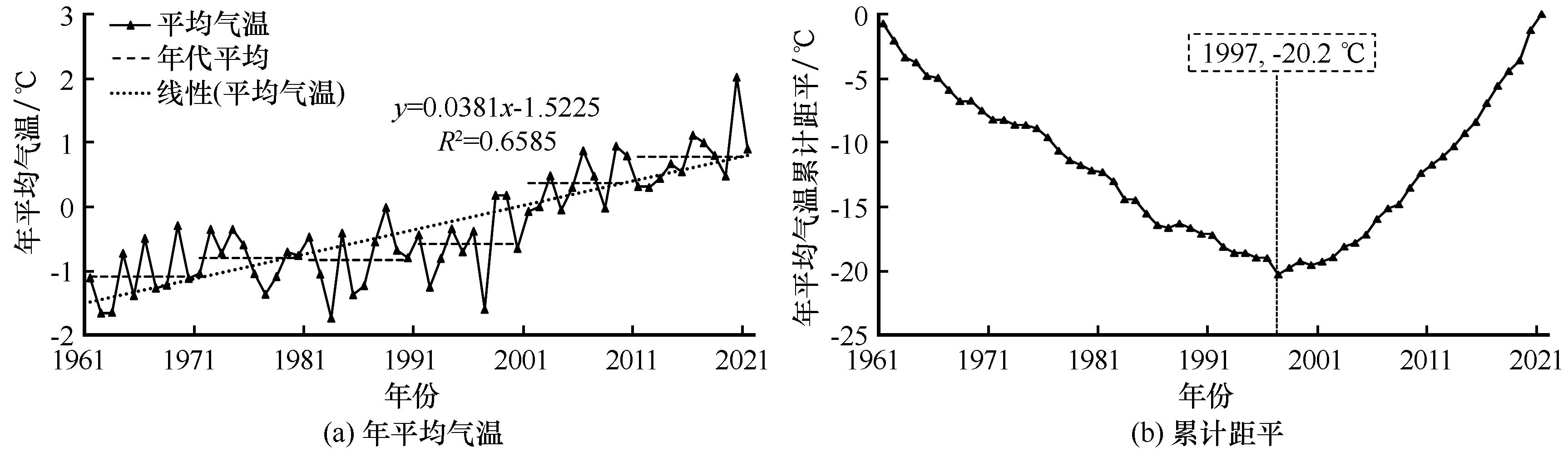 | 图2 1961—2021年三江源区年平均气温、年平均气温累计距平变化曲线(单位:℃) |