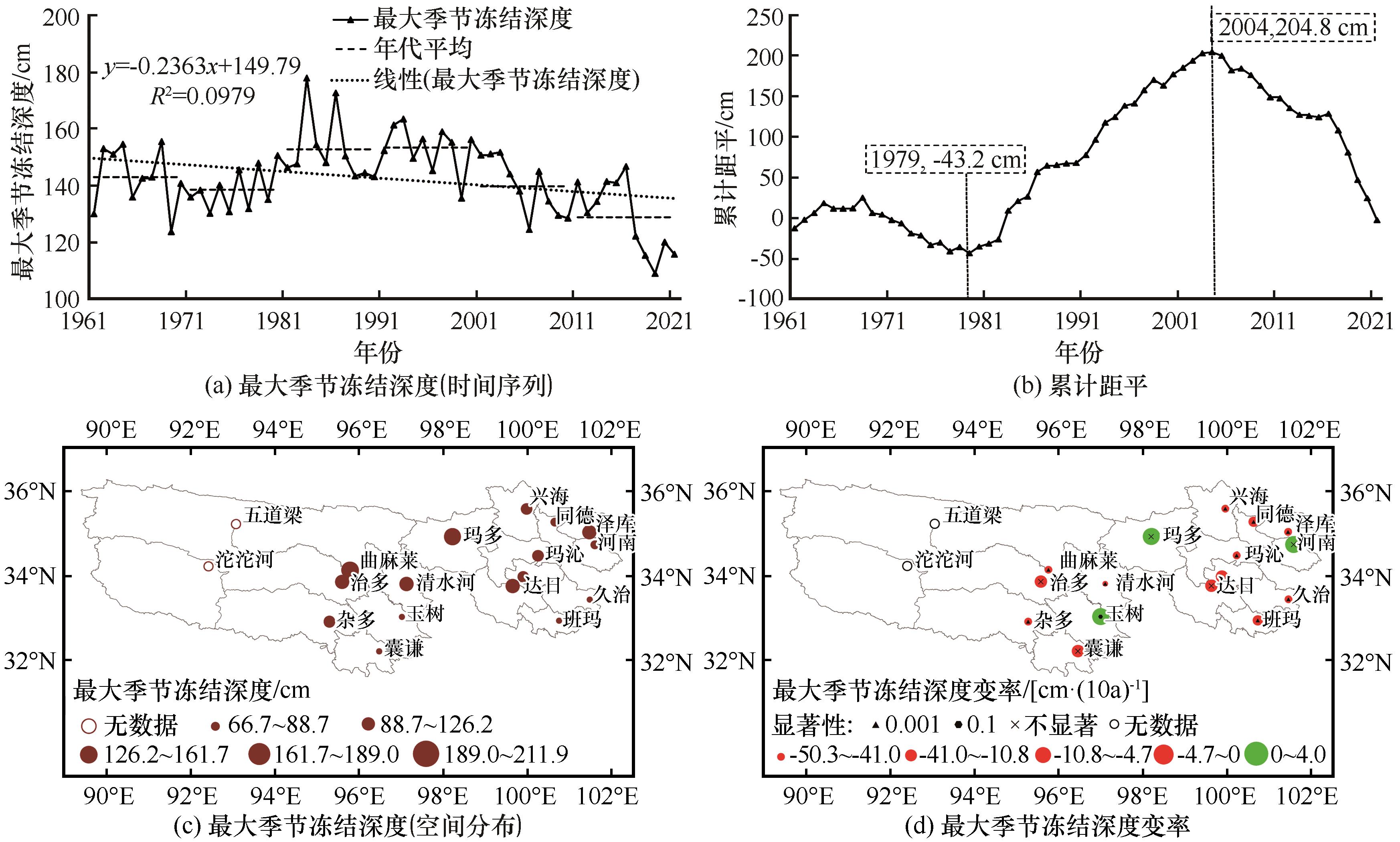| Fig. 4 Changing curve of annual maximum depth of frost penetration (unit: mm) (a), cumulative anomaly of the mean annual maximun seasonal freezing depth (b), spatial distribution map of the mean annual maximun seasonal freezing depth (unit: mm) (c), and change rate of the mean annual maximun seasonal freezing depth change rate [unit: cm?(10a)-1] (d) in the Three-River Source Region on northeastern Qinghai-Tibet Plateau from 1961 to 2021 |